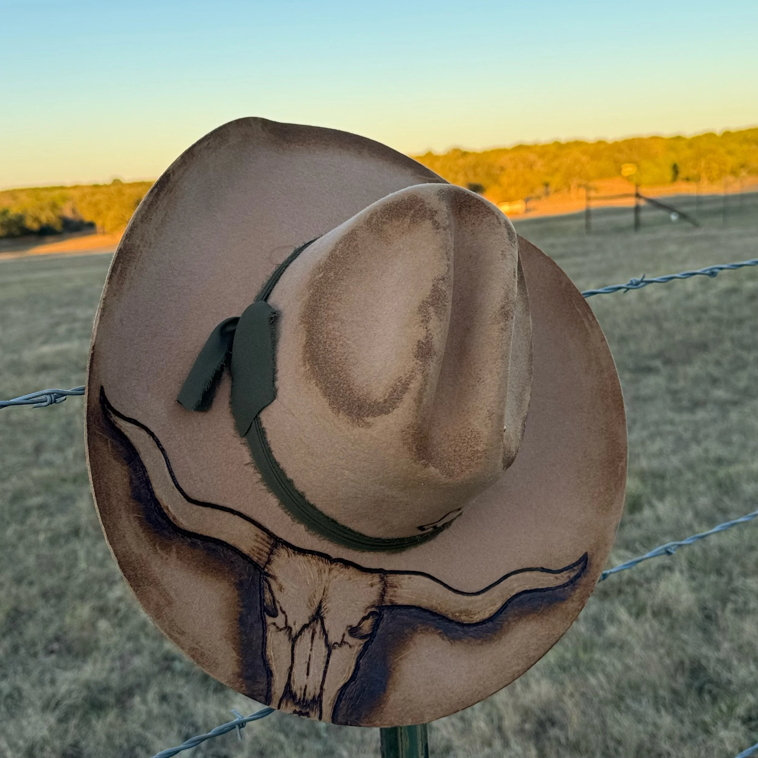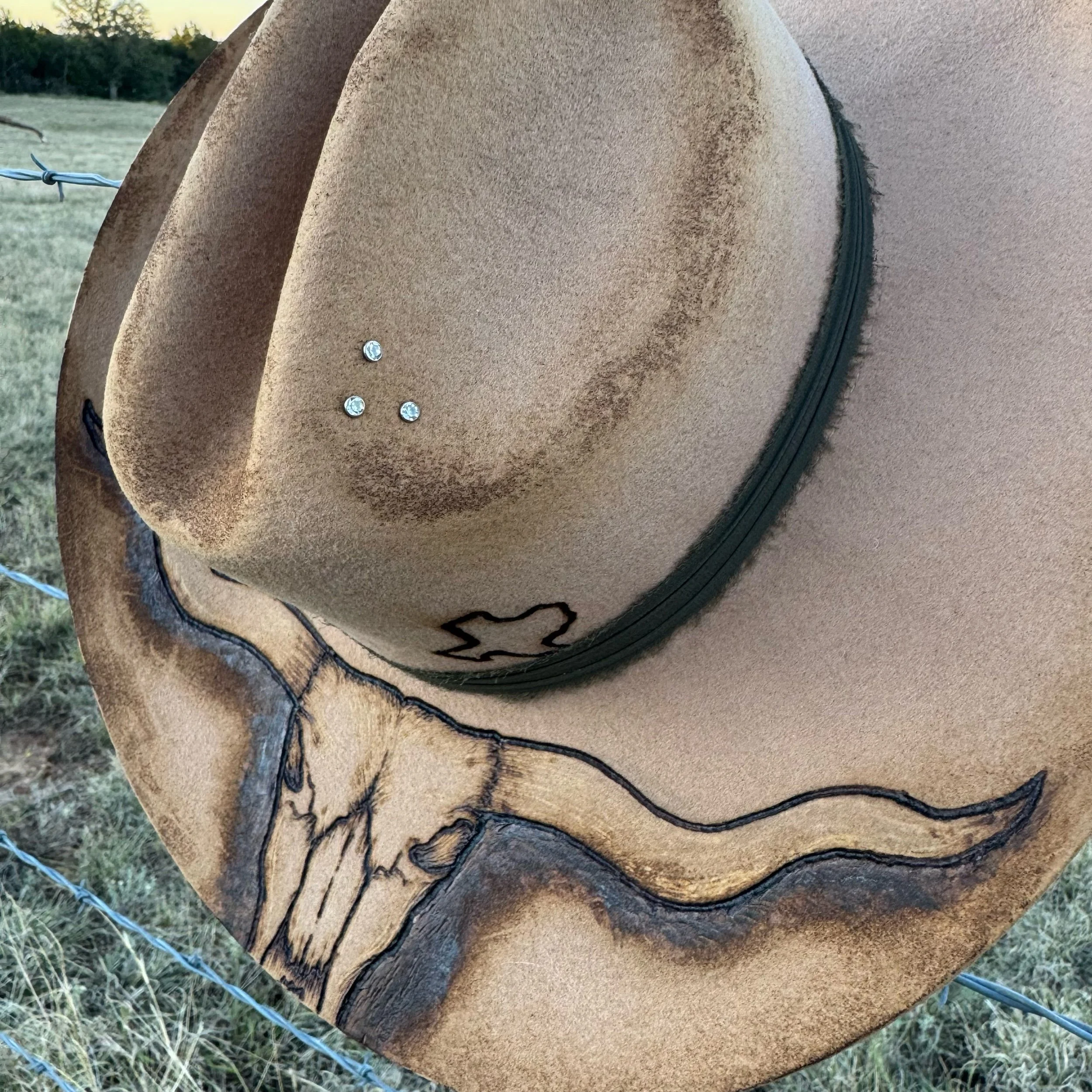 • Hand-burned Longhorn skull design on brim